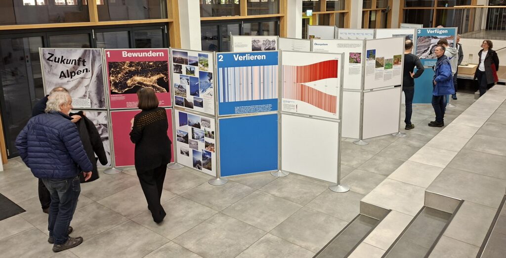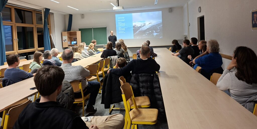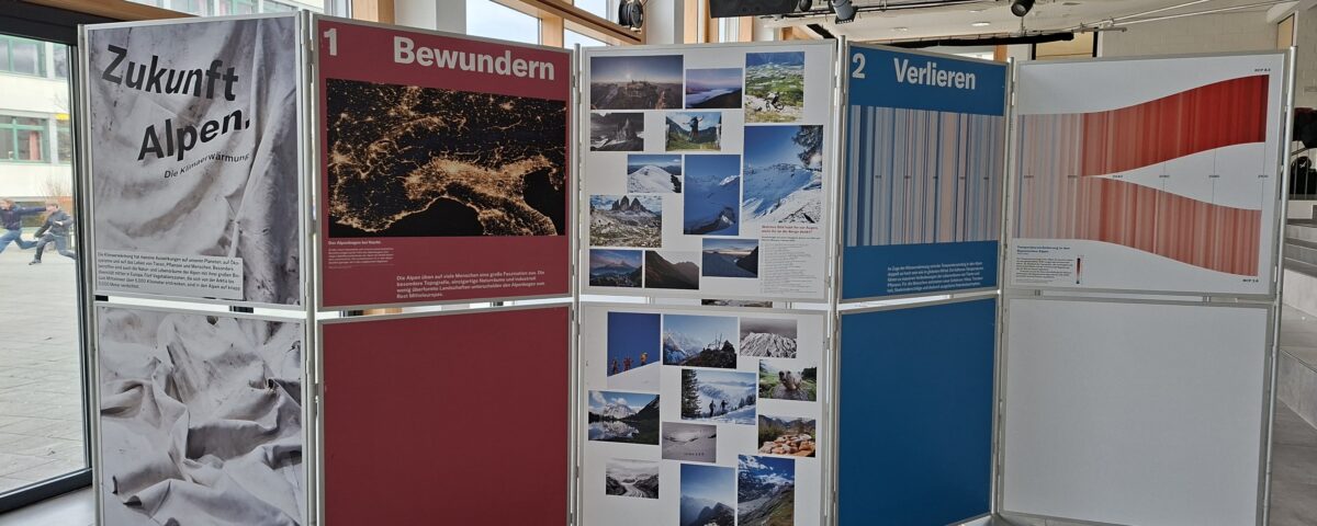 11. März 2026Im Rahmen der Umweltwoche war die Ausstellung des Deutschen Alpenvereins „Zukunft Alpen“ vom 23.03. bis 11.03. bei uns an der Schule. In verschiedenen Stationen konnte man über das Ökosystem Alpen, sowie dessen Veränderung durch den Klimawandel und menschlichen Einfluss durch Massentourismus lernen. Am 24.03. gab es zum Thema eine Abendveranstaltung für Eltern, Schüler und interessierte Bürger. Ab 18.00 Uhr konnte die Ausstellung besucht werden und um 19.00 Uhr wurden zwei Kurzfilme des DAV aus der Reihe „Berge in Bewegung“ vorgeführt. Im Anschluss an die sehr interessanten Dokumentationen diskutierten die Anwesenden mit Mitgliedern des DAV u.a. darüber, vor welchen Herausforderungen die Sektionen beim Erhalt ihrer Hütten stehen und wie diese nachhaltiger werden können. Durch den Abend führte der Klimaschutzmanager des Landkreise Robert Maier, der als Mitglied der Sektion Grafing-Ebersberg des DAV auch die Ausstellung zu uns an die Schule holte.