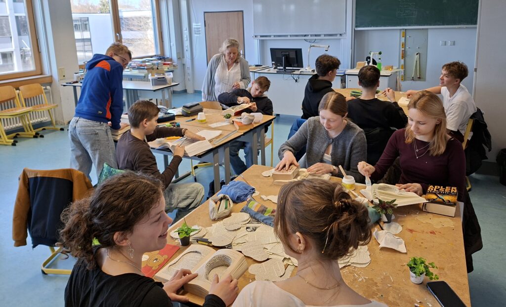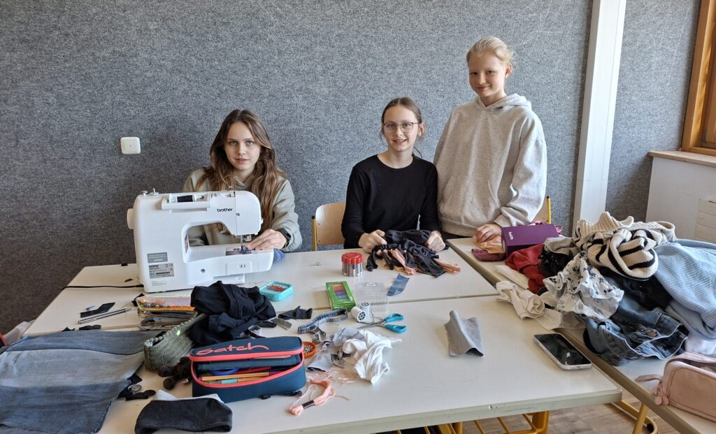Besonders beliebt waren in diesem Jahr wieder die Upcycling und Selbermach-Workshops. So wurde den Schülern beim Repair-Workshop, durchgeführt von MakerSpace e.V., gezeigt, wie man kaputte Gegenstände reparieren kann und sie damit vor der Müllhalde bewahrt. Beim Seifenworkshop konnten die Schüler aus Rohseife durch das Zugeben von Farbe, Duftöl und Blüten ihre eigene Seife herstellen und dabei lernen, dass man durch das Selbermachen von Dingen Müll vermeiden kann. Frau Ott vom Elternbeirat leitete die Teilnehmer in ihrem Kleidung Upcycling Workshop dazu an, wie man kaputte Kleidung repariert, bzw. sie durch Kürzen, Umnähen, etc. in etwas Neues verwandeln kann. Beim Holzupcycling, geleitet von Frau Wedlich, durften die Schüler aus Holzresten und Dosen wahre Kunstwerke gestalten und bei Book It Up und beim Bookfolding von Frau Achilles tolle Dekoobjekte kreieren.
