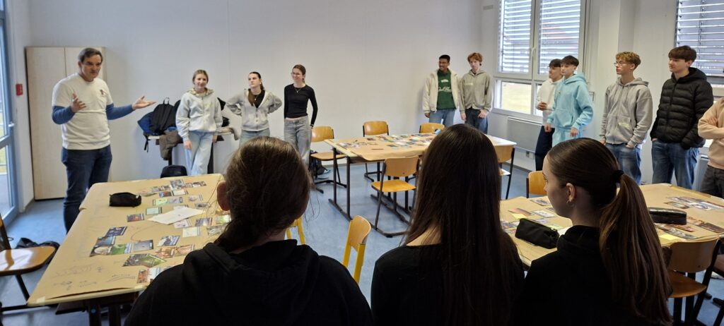 Darüber hinaus gab es wechselnde Tagesmottos, wie z.B. „Auch die KI verbraucht Energie“ oder „Be cool, walk to school“, die zu einem nachhaltigeren Leben anregen sollen. Alle 5. Klassen beschäftigten sich beim Umweltfrühstück, geleitet von Frau Burger-Gläser vom Museum Wald und Umwelt, mit dem CO2 Fußabdruck unseres Essens und die 6. Klassen lernten bei den Plastikmüllpiraten, wie wichtig es ist, Müll zu vermeiden, oder zumindest diesen richtig zu recyceln. Beim Windradworkshop von Frau Brombacher vom BUND wurden u.a. Konzepte zur Umsetzung von nachhaltigen Energiequellen diskutiert und beim Klimapuzzle, durchgeführt von Mitgliedern von ClimateFresk e.V., erarbeiteten sich die Schüler die multikausalen Zusammenhänge und Folgen des Klimawandels auf spielerische Art und Weise.